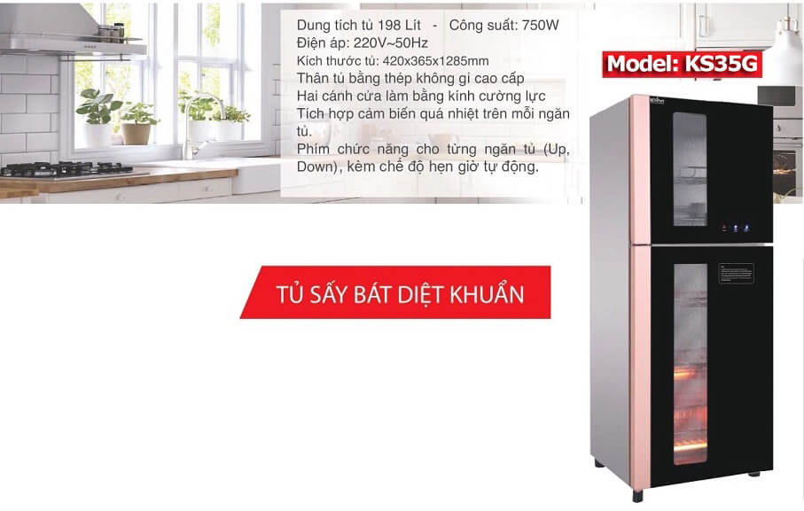 Tủ sấy & diệt khuẩn bát đĩa Kohn KS35G. Dung tích 198 lít. 2 ngăn sấy sử dụng cho đồ nhựa và đồ sứ. Phù hợp cho gia đình từ 4-10 người. BH 24 tháng