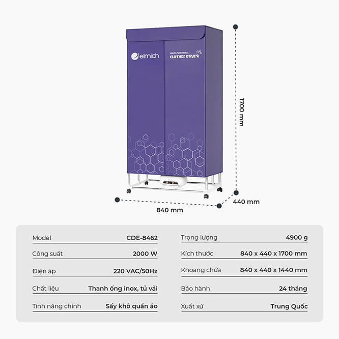 Tủ sấy quần áo Elmich CDE-8642. Công suất 2000W kết hợp sấy tủ phân nhiệt 360 độ cho hiệu quả sấy quần áo nhanh chóng. Hàng chính hãng, BH 24 tháng