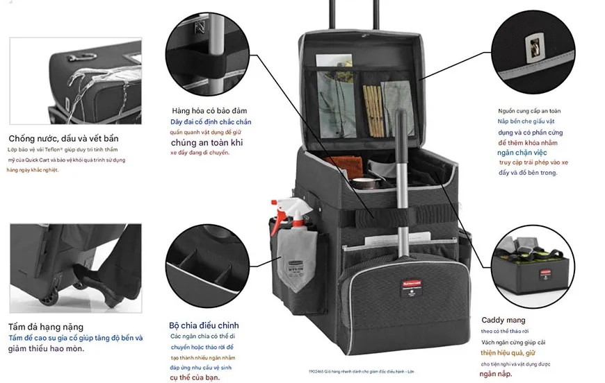 Vali kéo làm phòng thuộc dòng Executive Quick Cart là giải pháp thay thế cho xe đẩy buồng phòng cỡ lớn tại các phòng có diện tích nhỏ hoặc những khu gian cần ít dụng cụ vệ sinh. Với thiết kế xe đẩy phục vụ gọn nhẹ, tinh tế và khả năng vận hành êm ái, vali kéo làm phòng của Rubbermaid phù hợp cho các không gian cao cấp như khách sạn, resort hoặc nhà hàng.