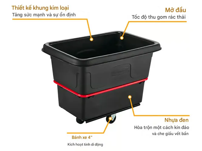 – Xe thu gom đồ giặt cỡ lớn Rubbermaid, màu đen được trang bị hệ thống bánh xe 12.7 cm đặt theo bố cục hình thoi, di chuyển êm ái, dễ dàng điều khiển và không để dấu vết.