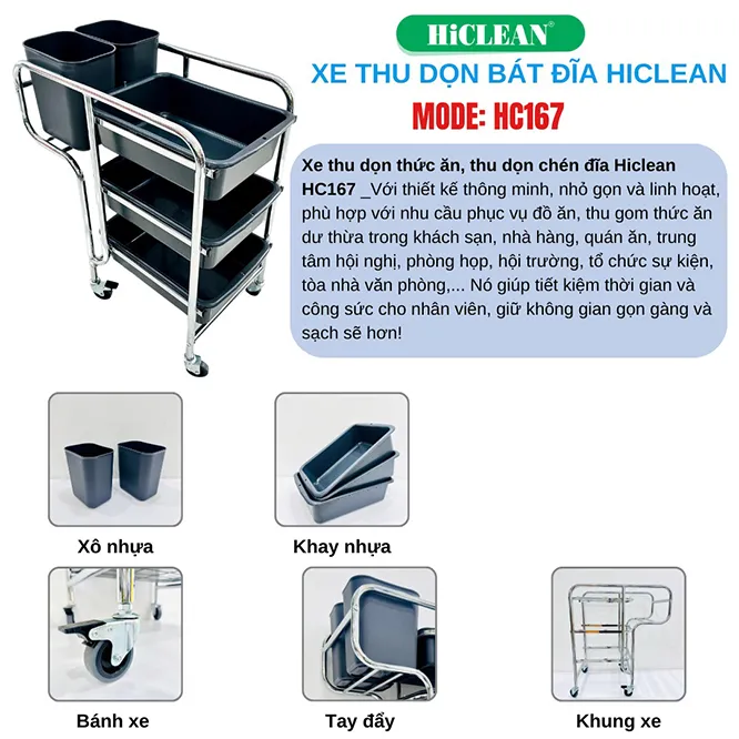 Xe đẩy dọn đồ ăn HiClean HC 167 thường sử dụng để thu dọn bàn ăn, thu dọn chén đĩa nhà hàng, phù hợp với nhu cầu phục vụ đồ ăn, thu gom thức ăn dư thừa trong khách sạn, nhà hàng, quán ăn, trung tâm hội nghị, phòng họp, hội trường, tổ chức sự kiện, tòa nhà văn phòng.