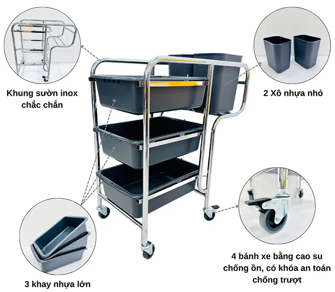 – Khung xe đẩy thức ăn được làm từ inox, khay đựng đồ ăn được làm bằng nhựa cho độ bền cao.