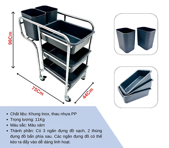– Kết cấu 3 tầng với 3 khay đựng và 2 thùng chứa đồ dơ