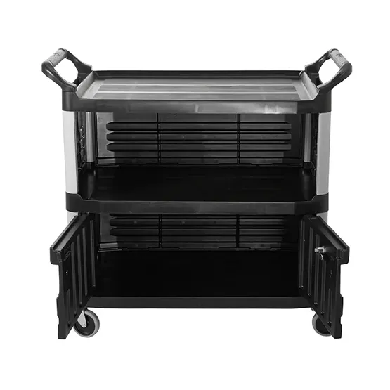 Xe đẩy phục vụ nhà hàng 2 tầng có vách kín và tủ FG409500BLA thường sử dụng để thu dọn bàn ăn, thu dọn chén đĩa nhà hàng cao cấp, phù hợp với nhu cầu phục vụ đồ ăn, thu gom thức ăn dư thừa trong khách sạn, nhà hàng, quán ăn, trung tâm hội nghị, phòng họp, hội trường, tổ chức sự kiện, tòa nhà văn phòng.