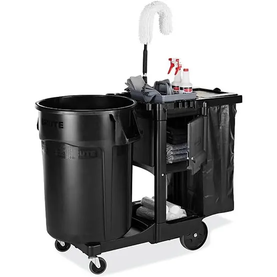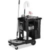 Xe đẩy vệ sinh thuộc dòng Executive nổi tiếng này có 11 tay cầm để giữ cây lau nhà, chổi và các dụng cụ cầm tay khác, 2 móc treo biển báo an toàn, túi nhựa vinyl 24 gallon (90 lít) có nắp đậy để đổ rác kín đáo, và thậm chí cả bệ để xô lau nhà hoặc thùng rác – tất cả được đặt gọn gàng trong một kích thước rộng 22 inch (55cm)! Xe có bánh xe bi 8 inch (20cm) và bánh xe 4 inch êm ái, mang lại khả năng di chuyển mượt mà, liền mạch.