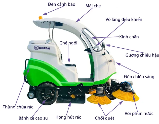 Xe quét rác ngồi lái Kumisai KMS 120A. Hiệu suất làm việc ≥ 14000 m2/h. Thời gian làm việc liên tục ≥ 6 h. Hàng chính hãng, bảo hành 12 tháng. Giá tốt nhất