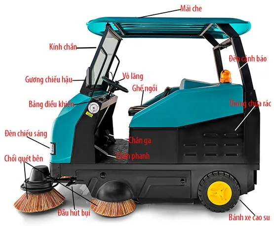 – Đầu hút rác: đầu hút được bố trí ngay phía sau chổi quét bên, với chức năng gom rác bụi và đưa tới thùng chứa. Tổng công suất hoạt động của máy lên đến 5500W, cho hiệu suất làm việc nhanh chóng và hiệu quả lên đến 12000m2/h.